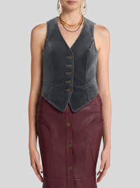 Cotton velvet waistcoat with buttons with raised Pegaso logo. This model features inner lining with a decorative, multicoloured floral Paisley print. • Regular fit • V-neck • Welt side slip pockets • Single-breasted closure • Made in Italy • The model is 5’10” (178 cm) tall and wears a size 40 (IT) PRODUCT DETAILS • 99% cotton, 1% elastane • Lining: 97% viscose, 3% elastane