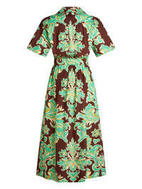 Venus-print cotton shirtdress Bold patterns and colours are pillars of ETRO's joyous aesthetic, and this shirtdress is exemplary. Crafted from cotton to an A-line silhouette, it is saturated with the brand's ornate Venus print, combining shades of green, brown and yellow. It is finished with signature Pegaso buttons and embroidery. Highlights - Mint green/chestnut brown/mustard yellow - Cotton - All-over floral print - Signature pegaso motif - Camp collar - Front button fastening - Short sleeves - Belted waist - Flared skirt - Straight hem - Mid-length Made in Italy Composition Cotton 100%