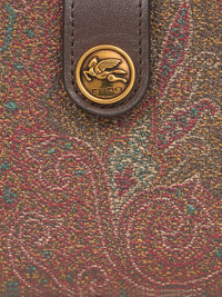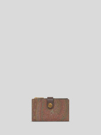 Wallet in iconic Paisley jacquard fabric, embellished with metal button bearing the raised Pegaso logo. • Dimensions (Width, Height): 5.7 x 3.3 inches (14.5 x 8.5 cm) • Flap and press-stud closure • Golden-finish metal details • Pegaso button • Zipped main pocket • Made in Italy PRODUCT DETAILS • Exterior: Paisley jacquard cotton fabric coated with matt texture and lined with canvas • Coating: 100% PVC • Trims: calfskin • Details: calfskin • Interior: 100% nylon