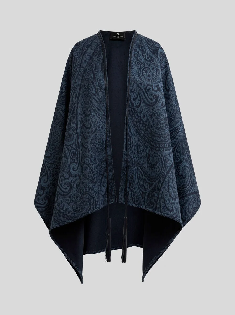 Cape in double-layered wool- and cashmere blend cloth with Paisley jacquard motif. It features a lace closure with two tassels at the bottom. • Lace fastening • Made in Italy PRODUCT DETAILS • 92% wool, 7% cashmere, 1% polyamide • Details: 83% polyurethane, 12% polyester, 5% viscose