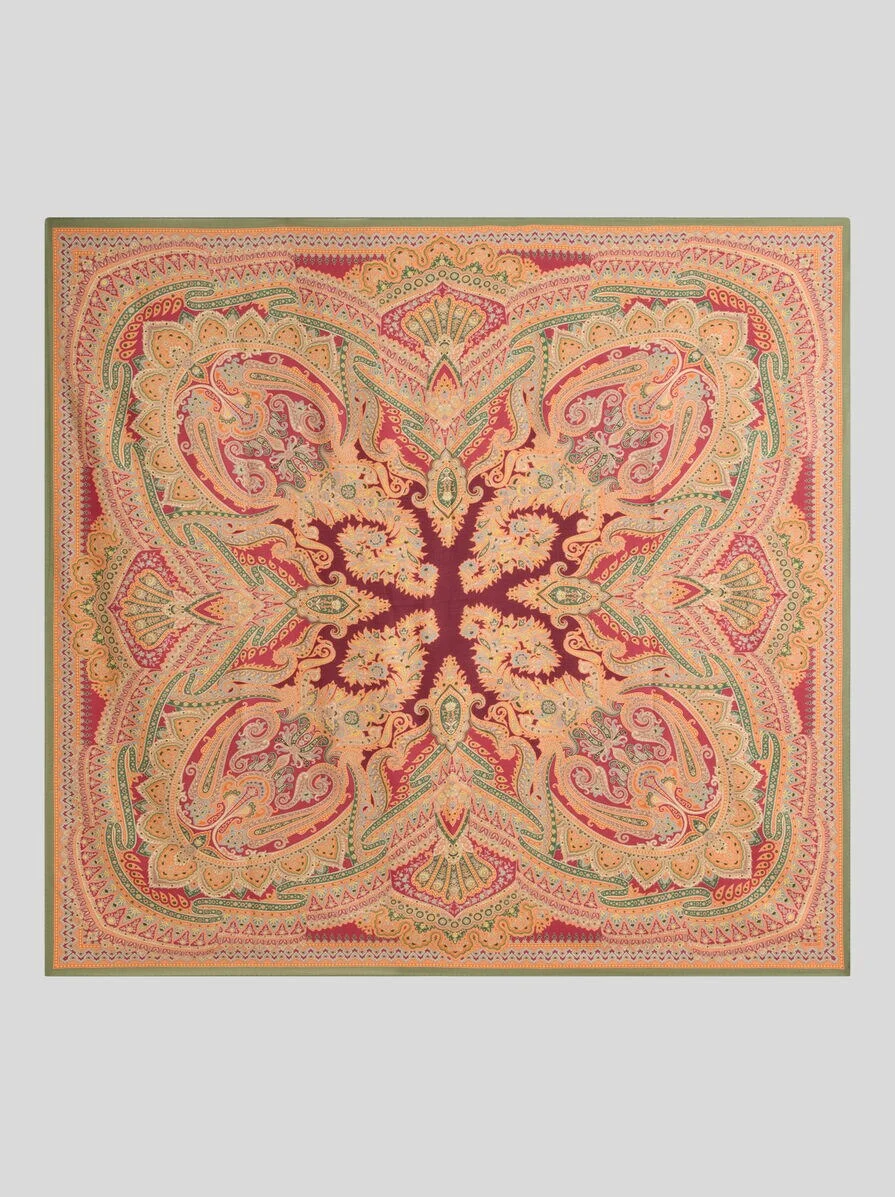 Wool- and silk-blend shawl with placed abstract print and Paisley detailing. This accessory is complete with a contrasting edge. • Size: 55.1 x 55.1 inches (140 x 140 cm) • Made in Italy PRODUCT DETAILS • 70% wool, 30% silk
