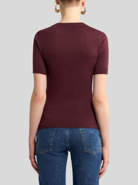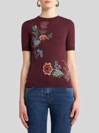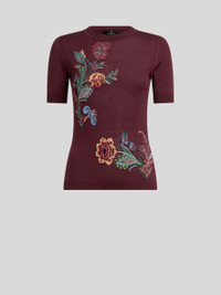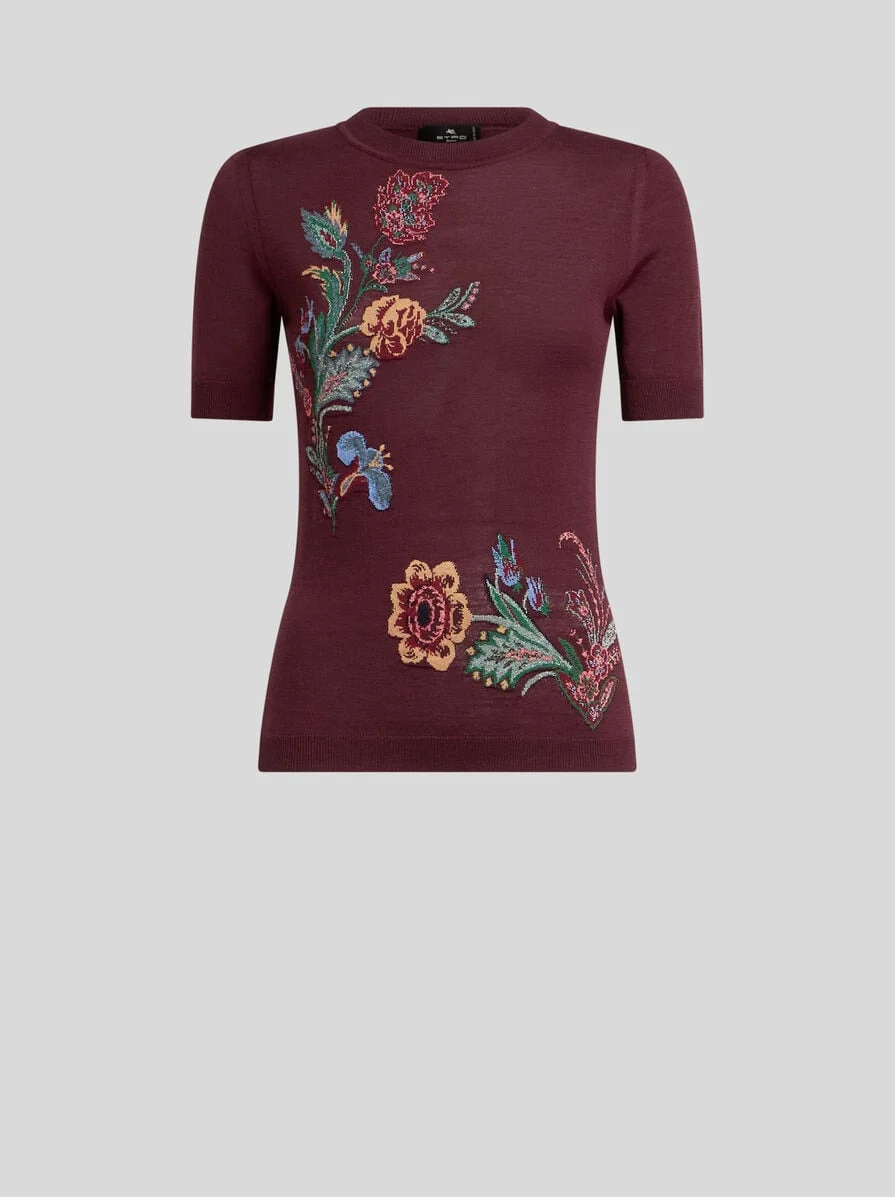 Short-sleeved sweater in wool-blend jacquard with inlaid, multicoloured floral motif adorned with fine lurex. • Fitted • Crew-neck • Short sleeves • Ribbed edging • Made in Italy • The model is 5' 9½" (177 cm) tall and wears a size 40 PRODUCT DETAILS • 82% wool, 11% polyamide, 5% viscose, 1% polyester, 1% cotton