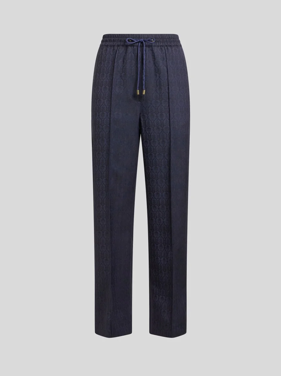 Jogging trousers in cool wool jacquard fabric with tone-on-tone motif. This model is complete with an elasticated waist with drawstring. • Regular fit • Side slip pockets • Elasticated waist with drawstring • Made in Italy • The model is 5' 9½" (177 cm) tall and wears a size 40 PRODUCT DETAILS • 100% wool