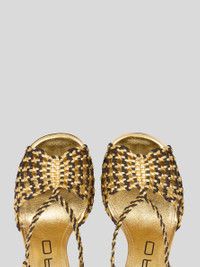 Heeled sandals with striking woven detailing. These feature a classic strap and metal-buckle closure. • Heel height: 3.5 inches (9 cm) • Strap closure • Made in Italy PRODUCT DETAILS • Upper: 100% polyurethane • Lining: 100% goatskin • Buckle: 100% brass • Sole: 100% cowhide
