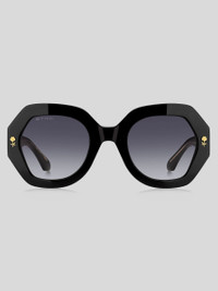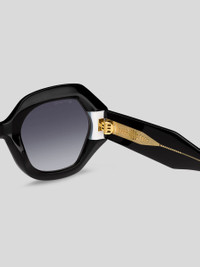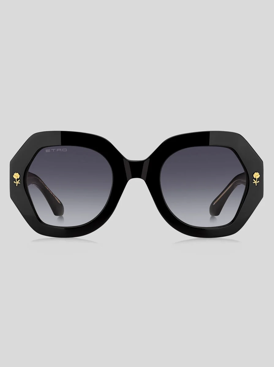 A tribute to the stripes and floral motifs that have become synonymous with ETRO's eclectic aesthetic, the "Colour Stripes" eyewear collection translates the Maison's iconic embroideries and prints into innovative sunglasses. The bold acetate frame with beveled profiles is detailed with a precious metal flower trim and a multicolour striped insert on the sides, while a wirecore visible through transparent temples adds a graphic touch. Lasered ETRO lettering on the lens and iconic acetate end tips, designed to recall the symmetry of the logo, complete these unique frames. PRODUCT DETAILS • Frame: 100% acetate • Lenses with UVA and UVB protection • Fit: International • Lenses:1.81 inches, bridge: 0.98 inches, temples: 5.70 inches (Lenses: 46 mm, bridge: 25 mm, temples: 145 mm) • Made in China
