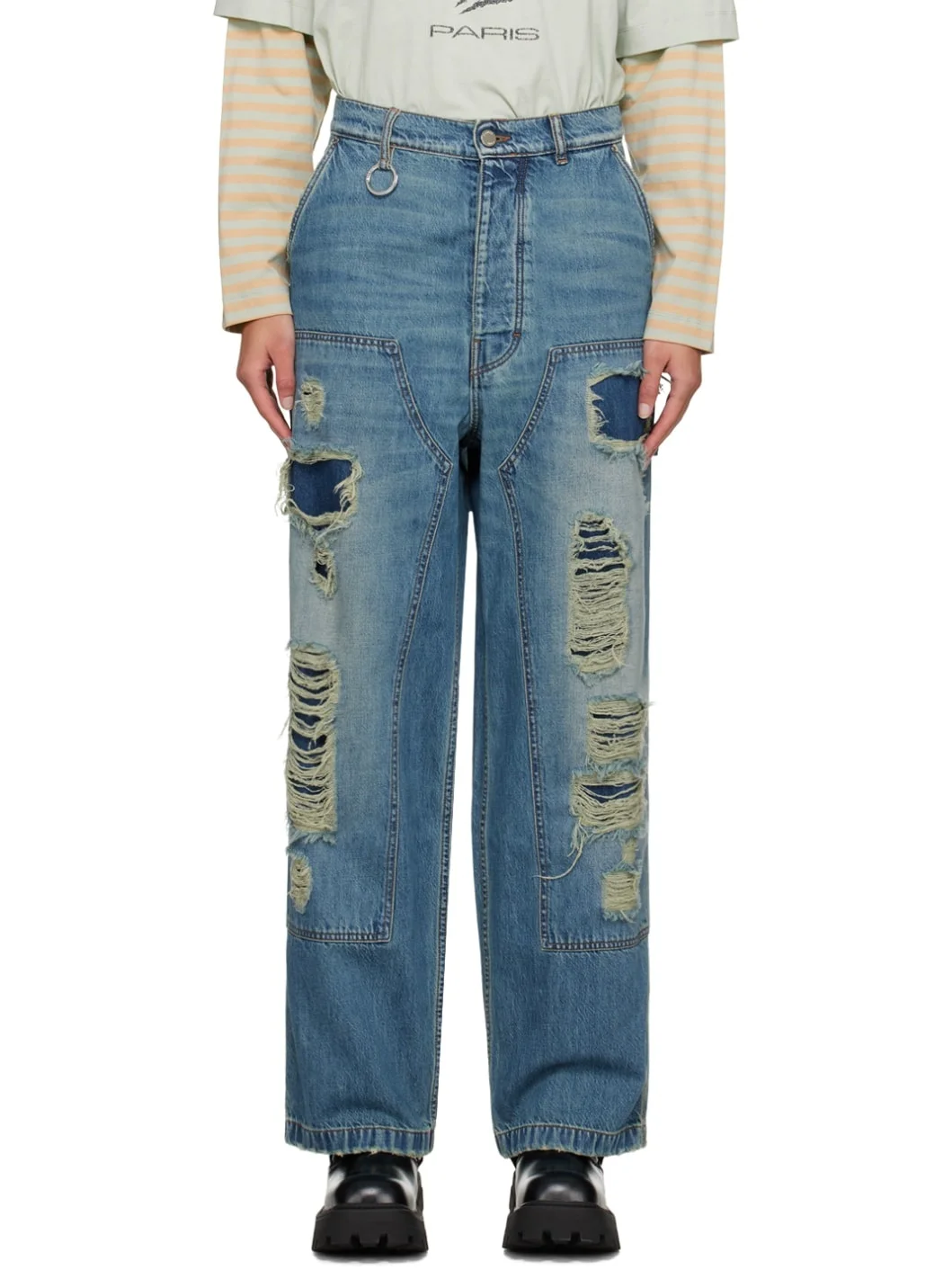 Wide-leg non-stretch organic cotton denim jeans. Distressing, cutouts, and raw edges throughout. · Layered and paneled construction · Logo-engraved keyring at belt loops · Four-pocket styling · Button-fly · Hammer loop and patch pocket at outseam · Patch pockets at outseam · Logo patch at back · Logo-engraved silver-tone hardware · Contrast stitching in tan Supplier color: Stone blue 100% organic cotton. Made in Portugal 241647F069000