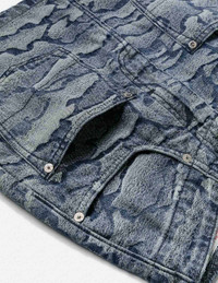2EAHTW5SK4012FFDN This fashion-forward denim skirt redefines your street style with a bold, avant-garde perspective! Inspired by the unique contours of garden pond stones, the allover Ishigaki camouflage jacquard pattern delivers striking visual impact. The wash process adds a vintage flair, while the V-shaped front waistband design blends sexy and cool vibes seamlessly, creating a standout, individualistic street-style masterpiece! - Fashion fit - 100% Cotton - Allover Ishigaki camouflage jacquard - Zip fly, 4 pockets - Godhead leather patch