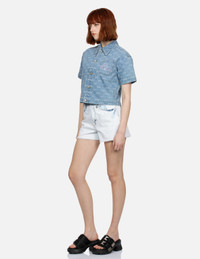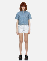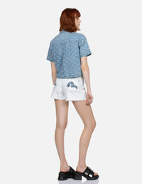 2ESHTW4SS4072FFDP Get ready for your summer wardrobe! This denim short-sleeve shirt is adorned with EVISU's unique jacquard pattern, adding a touch of glamour and luxury. The chest pocket is embellished with sparkling rhinestone accents, allowing you to exude confidence and charm during the summer season. FIT & STYLING: FASHION CARE HAND WASH COLD INSIDE OUT MILD DETERGENT DO NOT BLEACH HANG DRY ONLY COOL IRON ON REVERSE SIDE IF NEEDED STEAM IRONING MAY CAUSE IRREVERSIBLE DAMAGE DO NOT DRY CLEAN DO NOT IRON THE DECORATION