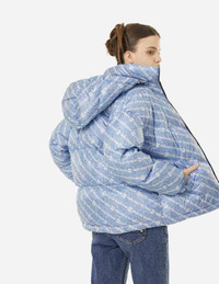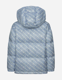2EAHTW4NJ4048FFSN A Stylish Fusion of Streetwear and Function - This down jacket showcases a blend of trendy and practical appeal. Crafted in a denim-inspired fabric, it features the brand's iconic logo and Kamon graphics, exuding a vintage streetwear vibe. The plush down lining provides exceptional warmth, while the detachable hood lends versatility to the styling. Equally suitable as a standalone piece or as an outer layer for cold weather, this jacket elevates any outfit with its multifaceted appeal. - Fashion fit - 100% Polyester - Allover slogan and kamon print - Detachable hood - Zip fastening, 2 pockets
