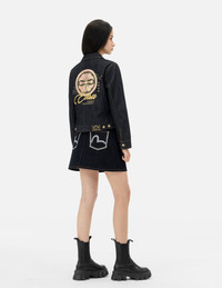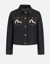 2ESHTW5DJ4001XXDN This premium denim jacket features a distinctive brand logo rendered in gold calligraphy, layered over an intricate brocade Kamon on the back. By refreshing the traditional brocade look, it epitomizes luxury. The gold buttons and the black gold leather tag add a refined touch, elevating its overall style and making it an eye-catching addition to your wardrobe. - Regular fit - 100% Cotton - Brocade Inserted Kamon and Logo embroidery - Brocade seagull embroidery - Button fastening, 4 pockets - Black-gold Godhead leather patch