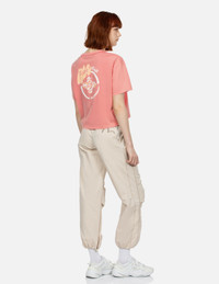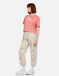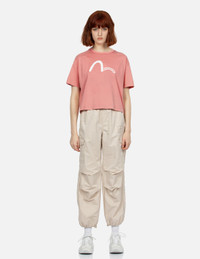 2ESGNW4TS6047LFCT Elevate your daily outfits with this cropped-fit EVISUKURO peachy T-shirt. Featuring the iconic Seagull logo on the front, it adds a touch of classic flair. The back is adorned with a printed brush art Kamon Logo, instantly drawing attention to your outfit. - Cropped fit - 100% Cotton - Brush art Kamon logo print