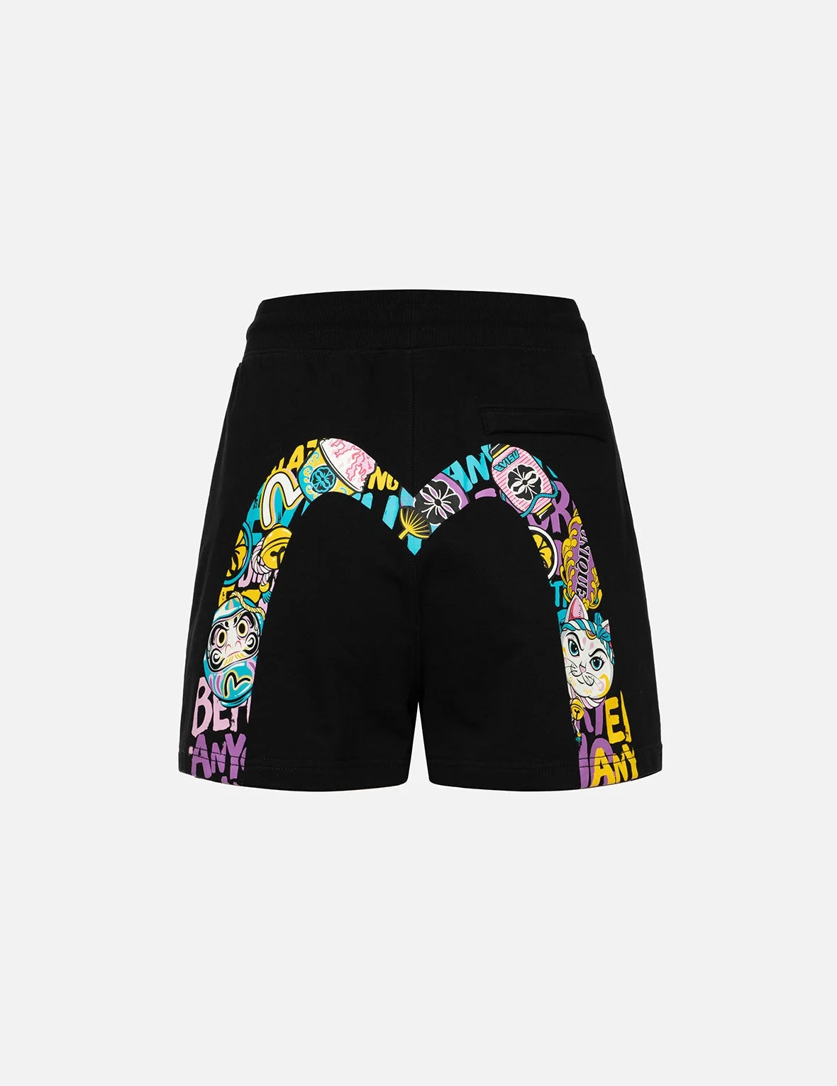 2ESHTW4ST4035LFCT Featuring a color-blocking theme, these sweat shorts are embellished with two contrasting color woven tapes on each side. The front left hem of the shorts displays the brand logo and a seasonal checkered pattern with a Kamon design. At the back, there is a Daicock print created by combining different festival elements such as Daruma and Fortune Cat, which corresponds to the pattern of the T-shirt collection, creating a coordinated series design. - Loose fit - 100% Cotton - Logo and Kamon Print - Daruma and Fortune Cat Daicock print - Color-blocking theme