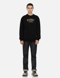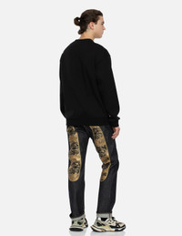 2EAHTM4JE701208DP The back of EVISU jeans features a prominent black and gold embroidered Daicock design, adorned with elegant crane motifs, showcasing the essence of Japanese aesthetics. The luxurious pattern exhibits rich layers and delicate coloration, adding a touch of grandeur and sophistication to the garment. - 2008 Regular Straight Fit - 99% Cotton, 1% Spandex - Crane embrodiery brocade Daicock - 12 oz denim - Button fly, 5 pockets - Godhead leather patch