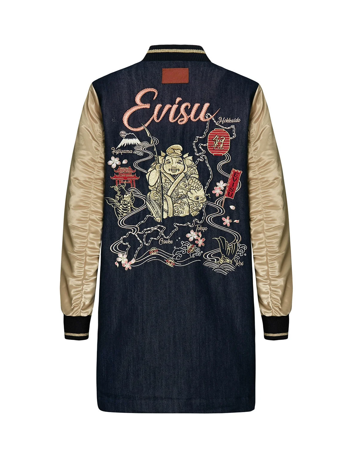 1EAHTW9CT768XX As one of the top pieces to invest in this fall, this long-body souvenir jacket will update casual looks in an instant. The light gold satin front panel comes with seagull, sakura mountain embroidery, whilst the back panel features a denim blocking with Godhead, Japan map and cursive EVISU logo embroidery. Team yours up with over-the-knee boots this fall. - Satin shell: 100% Polyester; Denim shell: 60% Cotton, 40% Polyester; Lining: 100% Polyester - Long body regular fit - 2 pockets, striped ribbed trims - Zip fastening - Godhead, Japan map, cursive EVISU logo, seagull and sakura mountain embroidery - Custom Made EVISU Heritage tag