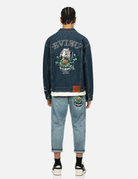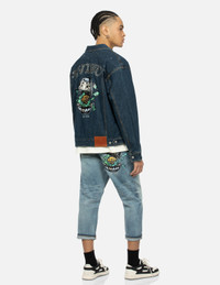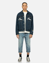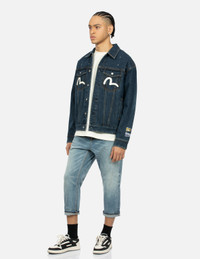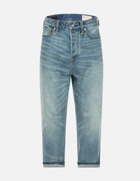 2ESHTM4JE103727DN Featuring a dazzling Diamond Daruma design, these jeans signify the forthcoming arrival of wealth and good fortune! Made from 12-ounce pure cotton denim, they sport a medium blue wash with hand scraping and whiskering for a naturally vintage appeal, making them a versatile staple for spring and summer. With an arc-shaped logo print on the left pocket and a Diamond Daruma pattern on the right, the lively print depicts an open Daruma scene filled with dancing diamonds and shimmering coins, symbolizing prosperity and luck. - 2027 Cropped fit - 99% Cotton, 1% Spandex - Diamond Daruma printed pocket - 12oz denim - Button fly, 5 pockets - Godhead leather patch