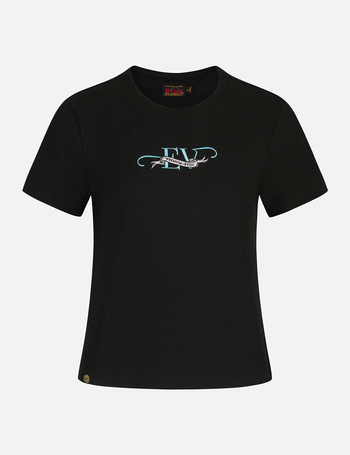 2ESHTW5TS4025SLCT This T-shirt is made from soft fabric and features an elegant cursive "EV" print on the front, showcasing a minimalist yet stylish appeal. - Slim fit - 46% Viscose, 40% Cotton,14% Elastane - Cursive logo "EV" print