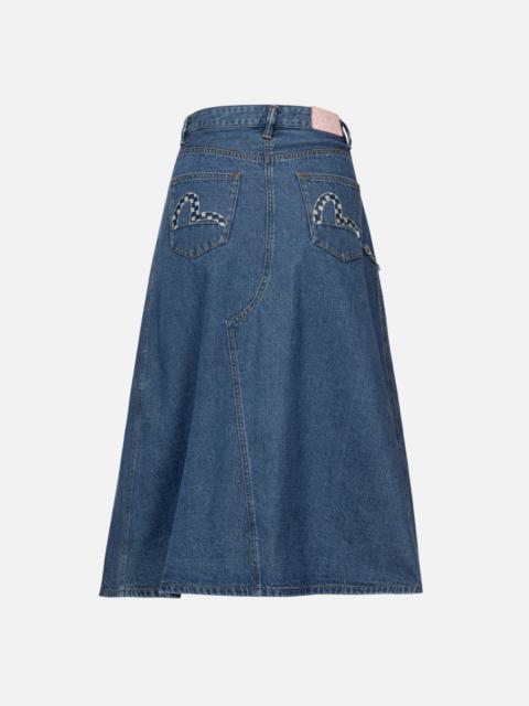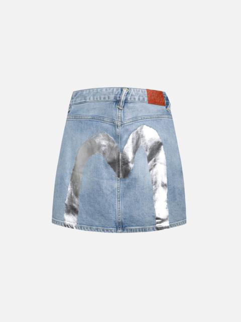 2ESHTW4SK4064XXDP The denim skirt is a must-have item this season! It undergoes a washing process that gives off a vintage faded effect. The A-line design accentuates the waist and creates a visually elongating effect. The front features pockets with this season's EVISU metal logo, enhancing the overall quality of the garment. The back showcases a gold and silver hand-painted Daicock, effortlessly exuding a refreshing and fashionable vibe! - Regular fit - 99% Cotton, 1% Spandex - EVISU metal logo trim - Foil print Daicok - Godhead leather patch