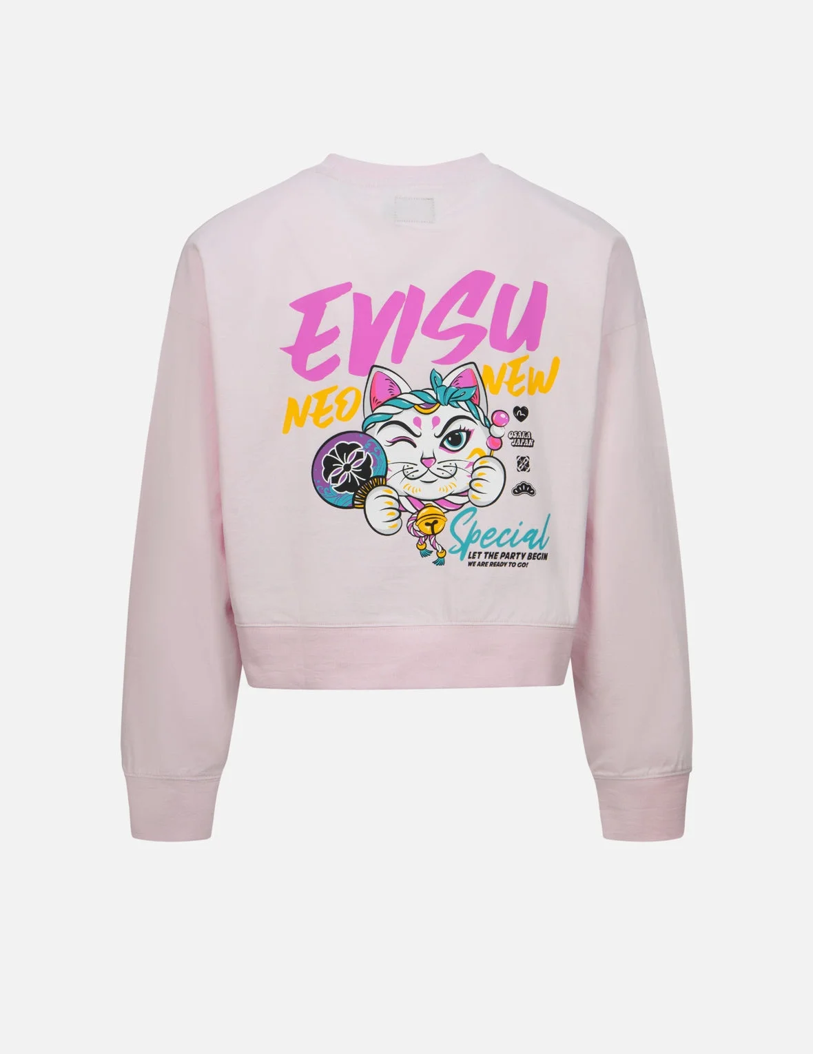 2ESHTW4TL4031CPCT Join the pursuit of fashion and festive vibes with the EVISU Fortune Cat! This sweatshirt showcases a print of the Fortune Cat holding a Japanese fan and a rice cake, symbolizing celebration and good fortune. It is complemented by vibrant-colored logo and slogan prints, highlighting the brand's unique style and vitality. FIT & STYLING: CROPPED CARE MACHINE WASH COLD INSIDE OUT DELICATE CYCLE DO NOT BLEACH HANG DRY ONLY COOL IRON ON REVERSE SIDE IF NEEDED STEAM IRONING MAY CAUSE IRREVERSIBLE DAMAGE DO NOT DRY CLEAN DO NOT IRON ON PRINT