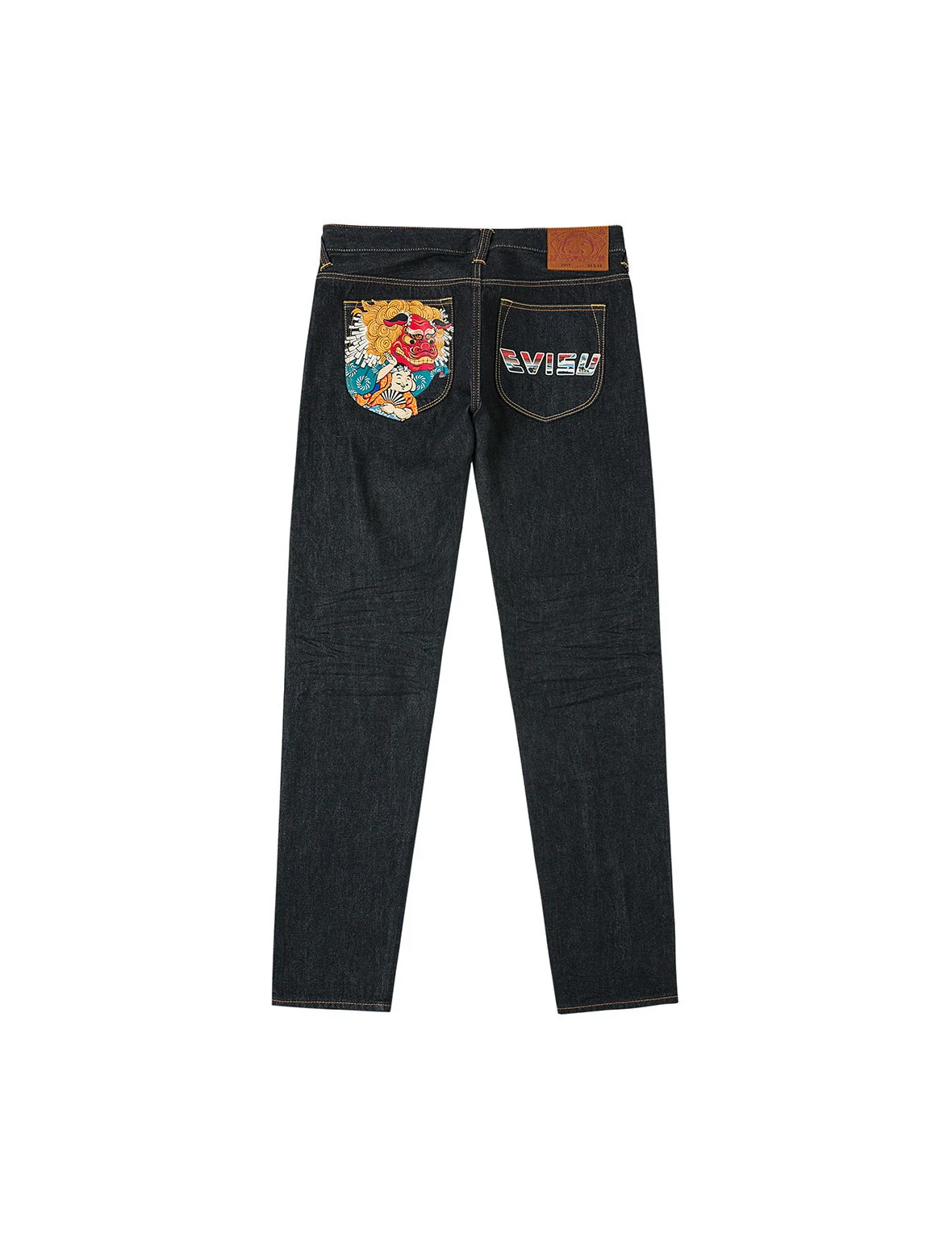 2EAHTM5JE121717DN This indigo denim jean channels a deep-toned avant-garde attitude, pulsing with trendsetting energy. The front pockets feature an inverted seagull embellishment, breaking norms with a fresh and striking detail; the back pockets steal the show with bold Godhead lion dance and EVISU logo prints, bursting with vibrant colors and playful flair, where art and rebellion ignite a unique spark. - 2017 Carrot fit - 100% Cotton - Godhead Lion Dance and logo print - Button fly, 5 pockets - Godhead leather patch