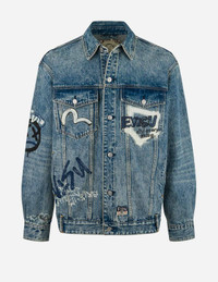 2ESHTM5DJ1050XXDN Drawing inspiration from street art, this denim jacket boasts bold graffiti prints on the back, incorporating signature brand motifs like the brand logo, Godhead and Daruma, exuding a distinctive vibe and vitality. The vintage wash finish adds a timeless, retro appeal to the classic denim. With its practical yet stylish front pocket design, this jacket is a must-have for anyone passionate about urban fashion. - Regular fit - 100% Cotton - Graffiti styles print logo, Godhead and Daruma - Button fastening, 4 pockets - EVISU Premium Quality Kamon tag - Godhead leather patch