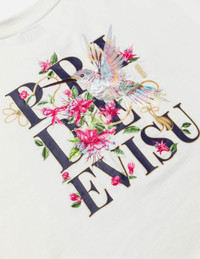 2ESHTW5SW4018OSCT This sweatshirt skillfully combines exquisite craftsmanship with unique brand elements. The front features delicate branded hardware, while the back showcases an enchanting scene of hummingbirds dancing among magnolia for the new season—hummingbirds frolicking amidst the magnolias, with falling petals cleverly clinging to the printed text and logo. Knots are interwoven among the letters, brimming with natural vitality and energy, making it suitable for various casual occasions. - Oversized - 100% Cotton - Hummingbird and magnolia embroidery - Logo print and metal accessory