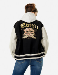 2EAHTW4JK4009FFSN Imbued with luxurious elements, this embroidered faux leather jacket exudes a distinct sense of personal style. Blending wool-like fabric and supple faux leather, the jacket features a soft texture and an oversized silhouette perfect for cooler seasons. The front showcases a double-layered embroidered applique, accentuated by a gilded, serrated frame that adds an opulent touch. The back employs a masterful combination of techniques, including intricate Kamon embroidery and metallic foil accents, creating a 3D visual impact. FIT & STYLING: FASHION CARE DO NOT WASH DO NOT BLEACH HANG DRY DO NOT IRON DRY CLEAN DO NOT IRON ON LEATHER PATCH DO NOT IRON ON PRINT