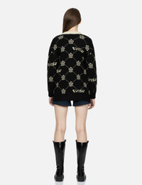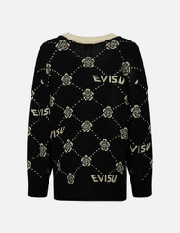 2EAHTW3CN4040LFAX Tailored for a loose fit, this black and gold cardigan is adorned with allover jacquard of EVISU logo and Kamon, making it a perfect item for layering up your fall winter styles. - Loose fit - EVISU logo and Kamon jacquard - Long sleeves, button fastening - Black yarn: 70% Acrylic, 30% Wool; Gold yarn: 65% Polyester, 35% Metallic film FIT & STYLING: LOOSE CARE DO NOT WASH DO NOT BLEACH DO NOT TUMBLE DRY DO NOT IRON DRY CLEAN ONLY