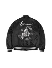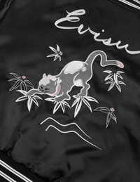2EAHTW5JK4045FFYQ Renowned for its craftsmanship, EVISU presents this black and white varsity jacket featuring embroidered logos on both the front and back. The back showcases an adorable fuzzy cat stealthily exploring bamboo, with its tail cleverly integrated into the brand's seagull motif, adding a playful touch. Perfect for both casual outings and sporty occasions, this jacket is an ideal expression of your unique style. - Fashion fit - 100% Polyester - Logo and fuzzy cat embroidery - Snap button fastening, 2 pockets