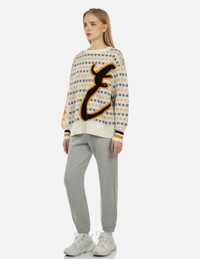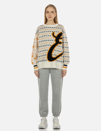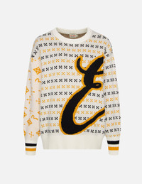 2EAHTW2SR356LFWX EVISU’s sweater has a warm tone and classic jacquard pattern with bold EVISU logo calligraphy across both panels. Cut for a loose fit, the sweater adds a lively vibe to your winter athleisure look. - Loose fit - EVISU logo calligraphy jacquard - Crew neck, long sleeves, ribbed trims - 47% Wool, 38% Viscose, 10% Nylon, 5% Cashmere
