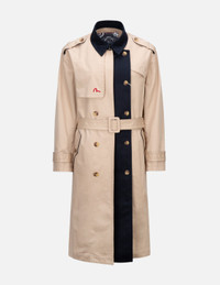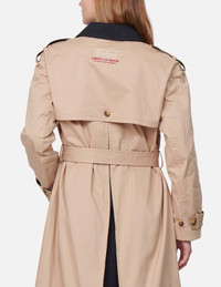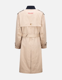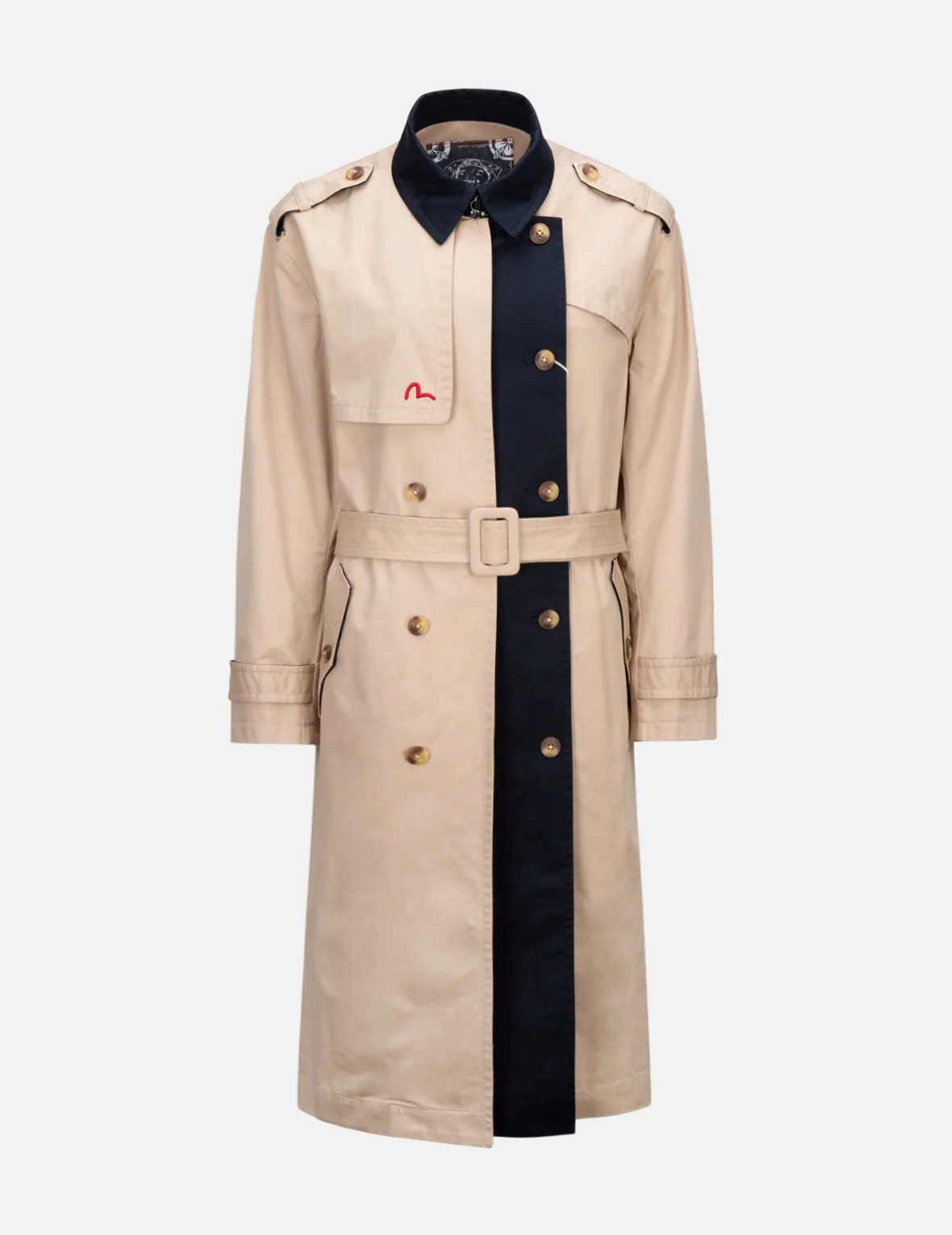 2EAHTW1CT226LFCT EVISU’s trench coat is tailored from Gabardine fabric - a water-proof one from Japan - in beige and dark navy blocking for a trendy look. Its front panel is decorated with a red seagull, while the back panel is embroidered with EVISU logo and slogan to channel a couture vibe. - Fashion fit - Fabric blocking design - Seagull, EVISU logo and slogan embroidery - Long sleeves, 2 pockets, detachable belt - Button fastening - Custom Made EVISU Heritage Tag - Body: 100% Cotton; Lining: 100% Polyester CARE DO NOT WASH DO NOT BLEACH DO NOT TUMBLE DRY COOL IRON ON REVERSE SIDE IF NEEDED STEAM IRONING MAY CAUSE IRREVERSIBLE DAMAGE DRY CLEAN ONLY REMOVE BELT PRIOR TO CLEANING BELT HAND WASH