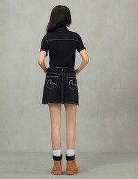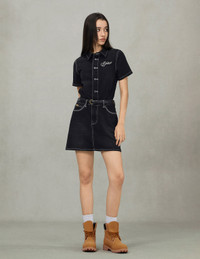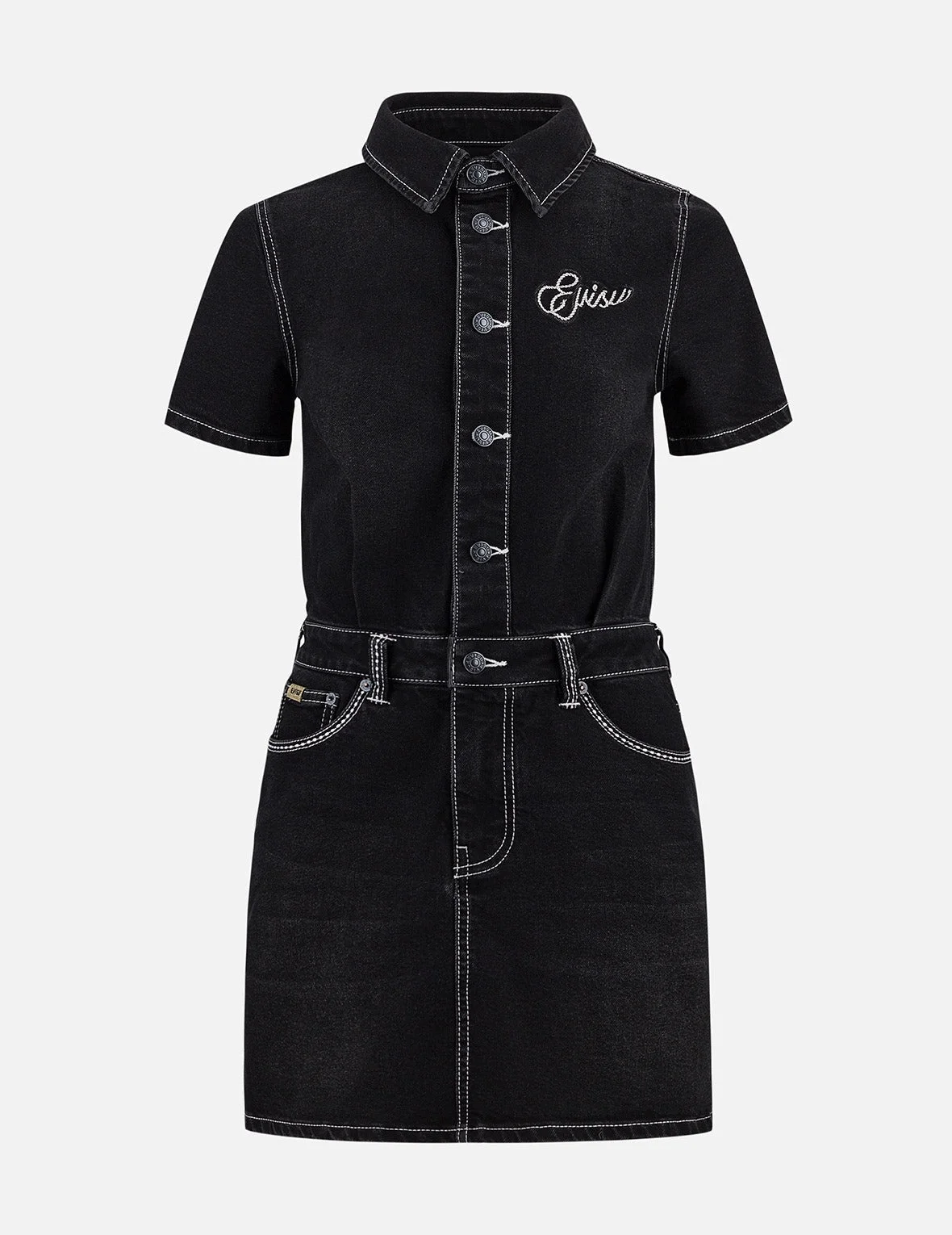 2ESHTW5DR4032FFDN Crafted from hefty black denim, this denim dress delivers a standout texture and a cutting-edge cut. The left placket boasts exquisite EVISU logo embroidery, infusing a dash of refined detail into the mix. The black-gold Godhead leather patch amps up the brand’s signature allure, radiating personality and poise—perfect for sculpting a look that’s effortlessly stylish and self-assured. - Fashion fit - 77% Cotton, 22% Polyester, 1% Elastane - Logo embroidery and seagull print - Button fastening, 5 pockets - Black-lettered Shiny Gold tag - Black-gold Godhead leather patch