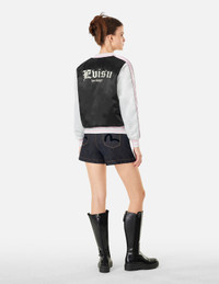 2EAHTW4JK4008LFYQ This souvenir jacket showcases a black base color, accented with feminine pink and off-white hues. The result is a balance of youthful energy and delicate charm. The left chest boasts a minimalist, 3D silver seagull embroidery, while the back is adorned with the brand logo, blending fashion and individuality. FIT & STYLING: LOOSE CARE DO NOT WASH DO NOT BLEACH DO NOT TUMBLE DRY COOL IRON ON REVERSE SIDE IF NEEDED STEAM IRONING MAY CAUSE IRREVERSIBLE DAMAGE DRY CLEAN ONLY