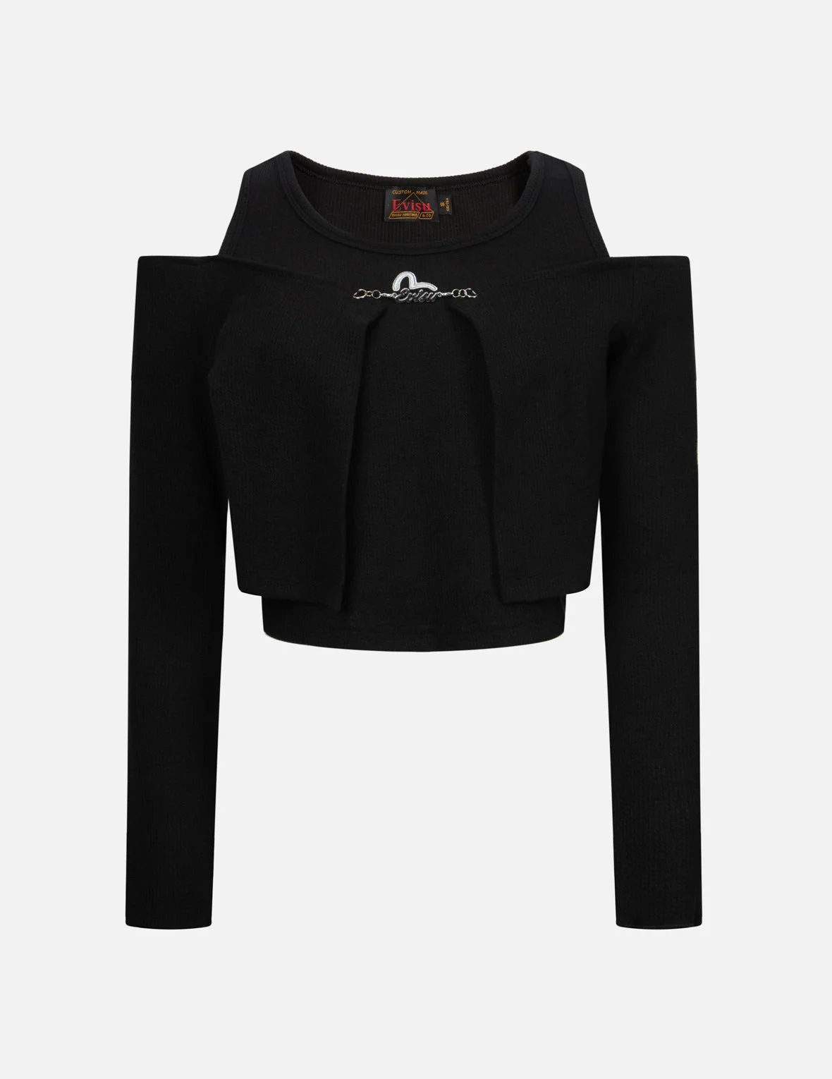 2ESHTW4TL4088FFSN EVISU adds the trendy elements of shoulder cutouts and faux two-piece design to this top, combining the styles of a vest and a cropped jacket. The incorporation of the EVISU metal logo trim enhances the overall aesthetic, adding a touch of sophistication and brand value. The alluring combination of shoulder cutouts and the faux two-piece design creates a fashionable and versatile look, exuding charm and allure. The curved hemline further accentuates the waist-cinching effect, making it a stylish choice for summer outfits. FIT & STYLING: FASHION CARE HAND WASH INSIDE OUT AND SEPARATELY DO NOT BLEACH HANG DRY ONLY COOL IRON ON REVERSE SIDE IF NEEDED STEAM IRONING MAY CAUSE IRREVERSIBLE DAMAGE DO NOT DRY CLEAN DO NOT IRON ON PRINT DO NOT IRON THE DECORATION REMOVE THE DECORATIVE BEFORE CLEANING
