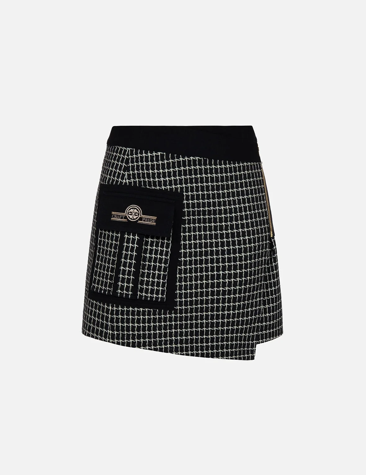 2EAHTW2SK160FFPL Tailored from metallic wool-blend in check pattern with fabric blocking details, EVISU’s asymmetric skirt is finished with Kamon and slogan embroidery to elevate your look. - Fashion fit - Fabric blocking design - Kamon and slogan embroidery - Zip fly, 1 pocket - Fabric A: 34% Polyester, 27% Wool, 22% Acrylic, 14% Nylon, 3% Lurex; Fabric B: 100% Cotton; Lining: 100% Polyester