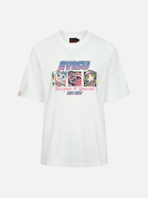 2ESHTW4TS4105OSCT This T-shirt features multiple prints, combining fashion with traditional elements to create a visually rich and diverse effect. The prints consist of logos, Daruma, Fortune Cat, and festival elements, intertwining to showcase a unique style and innovative design that is full of artistic and personal flair. FIT & STYLING: OVERSIZE CARE MACHINE WASH COLD INSIDE OUT DELICATE CYCLE DO NOT BLEACH HANG DRY ONLY COOL IRON ON REVERSE SIDE IF NEEDED STEAM IRONING MAY CAUSE IRREVERSIBLE DAMAGE DO NOT DRY CLEAN DO NOT IRON ON PRINT