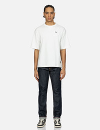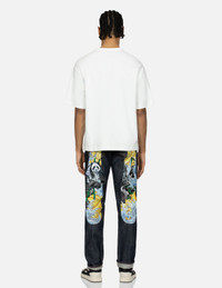 2ESHTM4JE702317DP Featuring a unique design with pandas, bamboo, and ocean waves, resulting in a refreshing visual effect. Made from 12.5 ounce denim, the back showcases a Daicock created using digital printing, while the upper layer combines different stitch techniques and meticulous craftsmanship to create an intricate pattern. The design is rich in layers, with vibrant colors and a luxurious appearance. - Carrot Fit Jeans #2017 - 99% Cotton, 1% Spandex - 12.5 oz denim - Japanese-inspited design of Pandas, bamboo, and waves embroidery - Button fly, 5 pockets - Godhead leather patch