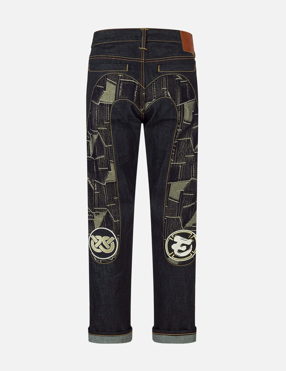 2EAHTM4JE113217DN With a fresh design, EVISU adds a fashionable flair to its iconic elements: these jeans feature a striking patchwork Daicock on the back, made from Japanese metallic jacquard denim, embodying luxury and sophistication. The cuffs are detailed with the Wheel of Wisdom and the brand's signature "E" metal embroidery, creating an exquisite piece that exudes value. - 2017 Carrot fit - 100% Cotton - Patchwork Daicock Insert - Wheel of Wisdom and brand logo "E" embroidery - Button fly, 5 pockets - Godhead leather patch