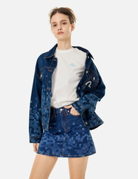 2EAHTW4DJ4032OSDN This denim jacket blends fashionable trends and the brand's signature style, showcasing a unique personalized design. The patchwork of deep and light plaid patterns, with a subtle seagull graphic, creates a modern, pixelated aesthetic. The front chest pockets feature a white seagull embroidered in a checkered pixel effect, adding a cool, streetwear-inspired touch. FIT & STYLING: OVERSIZE CARE MACHINE WASH COLD INSIDE OUT AND SEPARATELY DELICATE CYCLE DO NOT BLEACH HANG DRY ONLY COOL IRON ON REVERSE SIDE IF NEEDED STEAM IRONING MAY CAUSE IRREVERSIBLE DAMAGE DO NOT DRY CLEAN