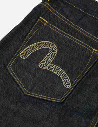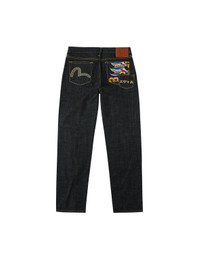 2EAHTM5JE106920DN Enter with understated cool, then turn heads with a bold twist! This denim jean sets a steady tone with its subtle front design, only to unleash an avant-garde storm at the back pockets. Adorned with embroidery of seagulls, Japanese temple, floral, and the Japanese EVISU logo, the richly composed and 3D pockets blend art and culture for a truly unique allure. Every detail narrates the brand’s story, making it your ultimate street-style favorite! - 2000 Regular fit - 100% Cotton - Seagull, Japanese temple, floral and the EVISU logo in Japanese embroidery - Button fly, 5 pockets - Godhead leather patch