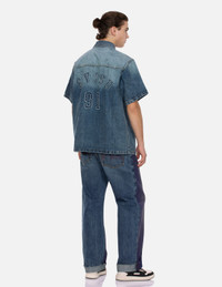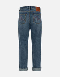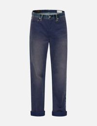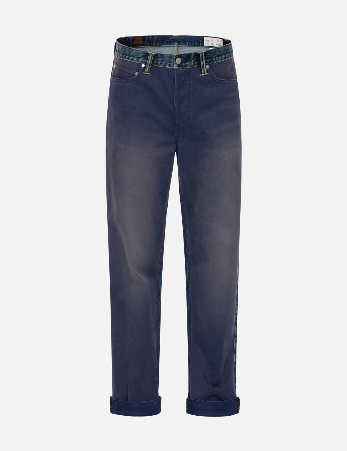 2EAMAM4JE1138BGDN The vintage wash and color block paneling are the biggest selling points of this season's collection! This jeans features a relaxed, comfortable fit that is also stylish. The front is designed with a panel of deep indigo twill cotton, which contrasts elegantly with the classic blue denim of the back, creating a visually appealing look that is effortless yet refined. - Baggy fit - 100% Cotton - Chino front panel design - Seagull applique embroidery with frayed edges - Button fly, 5 pockets - Godhead leather patch