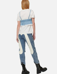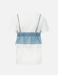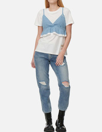 2ESHTW2BL173XXCT Constructed with a crisp white T-shirt and a light indigo denim bra top on the top, this 2-in-1 top is a statement summer staple is peppered with a seagull embroidery at chest. - Regular fit - 2-in-1 design, seagull embroidery - T-shirt: crew neck, short sleeves; Denim bra top: adjustable straps, zip fastening - Custom Made EVISU Heritage tag - Body: 100% Cotton; Denim bra top: 82% Polyester, 18% Rayon; Lining and hem blocking: 100% Polyester