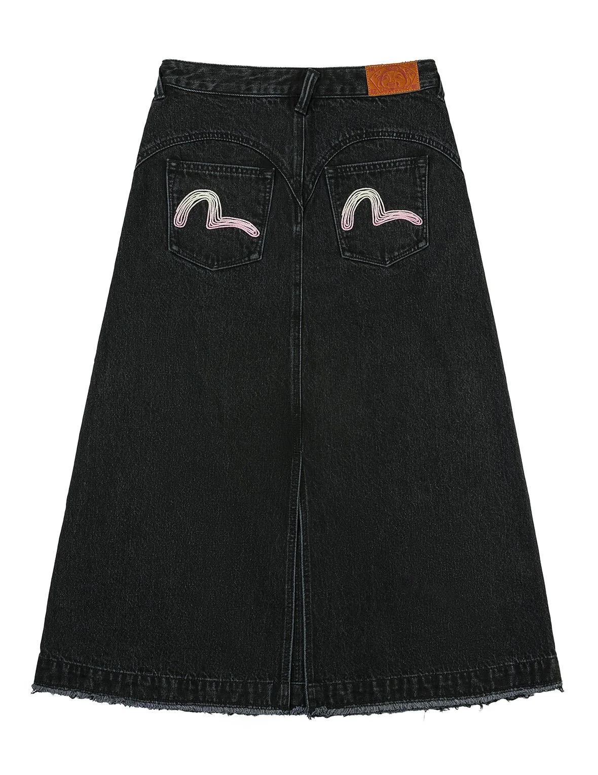2EAHTW5KL4028FFDN This black denim midi skirt instantly ignites your fashion inspiration! The front features a seagull-shaped distressed design with frayed tassel edges, showcasing a bold and free-spirited vibe. The Daicock line seamlessly integrates into the back yoke, adding a striking personality. The back pocket shines with a pink dual-tone gradient seagull chain embroidery, enhanced by a hand-brushed, carefree finish that infuses the entire look with artistic flair—perfect for a street-cool masterpiece! - Fashion fit - 100% Cotton - Pink dual-tone seagull chain embroidery - Distressed effect - Zip fly, 5 pockets - Godhead leather patch