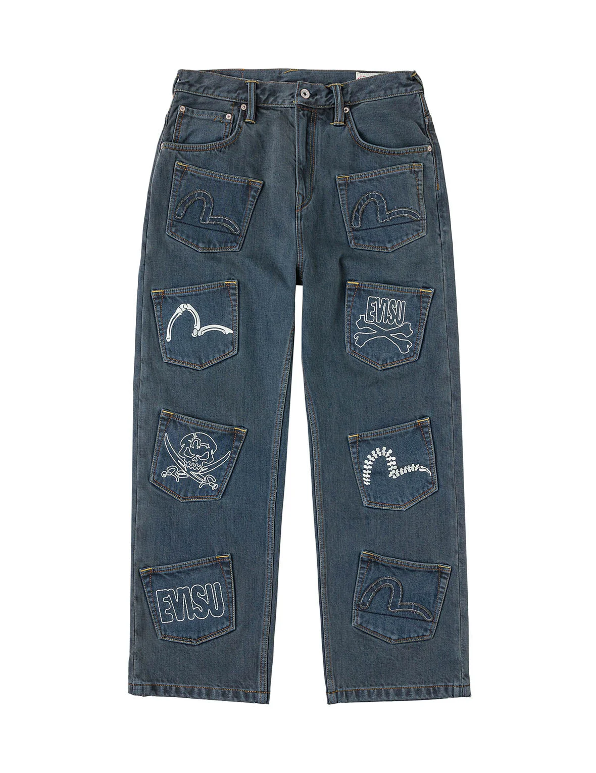 2ESHTM6JE7030FFDN Functional multi-pocket construction brings practical convenience to these jeans for urban dressing, blending utilitarian details with a modern streetwear aesthetic. Distressed seagull, skull and bone embroideries are featured on each pocket, expressing a rough yet refined sense of contrast. - Fashion fit - 100% Cotton - Pockets: 87% Polyester, 13% cotton - Multi-pocket design - Zip fly, 13 pockets