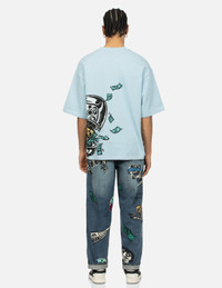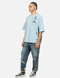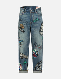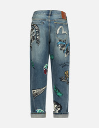 2ESHTM4JE1091RXDN These washed denim jeans are themed around old-school tattoos commonly found in 'Take A Chance'. It features bold and clear line patterns, including classic tattoo motifs such as seagulls, diamonds representing wealth, poker card suits symbolizing games and victory, dice combinations representing seizing opportunities, and ribbons representing honor and courage. These designs embody a rugged, rebellious, and free-spirited attitude. - Relaxed fit - 99% Cotton, 1% Spandex - Washed effect - Old-school tattoo motifs: Seagulls, diamonds, poker card suits, dice combinations, ribbons - Button fly, 5 pockets - Godhead leather patch