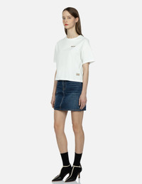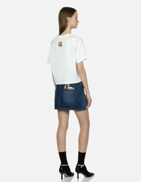 2ESHTW3SK180HWCT Instilling in oriental aesthetics in its streetwear staples, EVISU’s denim skirt is decorated with Tsubaki pattern seagull embroidery on the back pockets. It is cut for a regular high waist fit and washed with a worn in feel. - 10oz denim - Regular high waist fit - Tsubaki pattern seagull embroidery, graphic foil print - Zip fly, 5 pockets - Godhead leather patch - 100% Cotton FIT & STYLING: HIGH WAIST CARE MACHINE WASH COLD INSIDE OUT AND SEPARATELY DELICATE CYCLE DO NOT BLEACH HANG DRY ONLY COOL IRON ON REVERSE SIDE IF NEEDED STEAM IRONING MAY CAUSE IRREVERSIBLE DAMAGE DO NOT DRY CLEAN DO NOT IRON ON PRINT