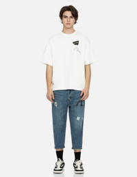 2ESHTM4JE802827DN This pair of jeans features a vintage theme and has undergone a washed treatment. It showcases intentional distressed details, including ripped holes, hand-stitched Seagull, restructured pocket designs, and embroidered patch logos. These details create a fashionable and nostalgic atmosphere, adding a unique charm to your outfit. - 2027 Cropped fit - 55% Cotton, 45 Linen - 11.8 oz denim - Seagull patchwork and logo embroidery - Distressed details - Button fly, 5 pockets - Godhead leather patch