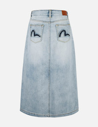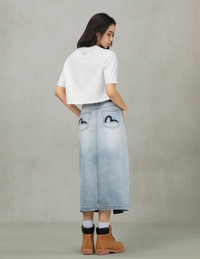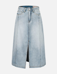 2ESHTW5KL4054FFDN This versatile and essential denim midi skirt features a silver-blue hue achieved through a washed treatment, showcasing a unique sense of style. The back pocket incorporates contrasting colors and a deliberately distressed Seagull, while the front boasts a chic slit design that allows each step to appear elegant and fluid, perfectly accentuating your silhouette. - Fashion fit - 100% Cotton - Deconstructed Seagull - Washed - Slit, Zip fly, 4 pockets