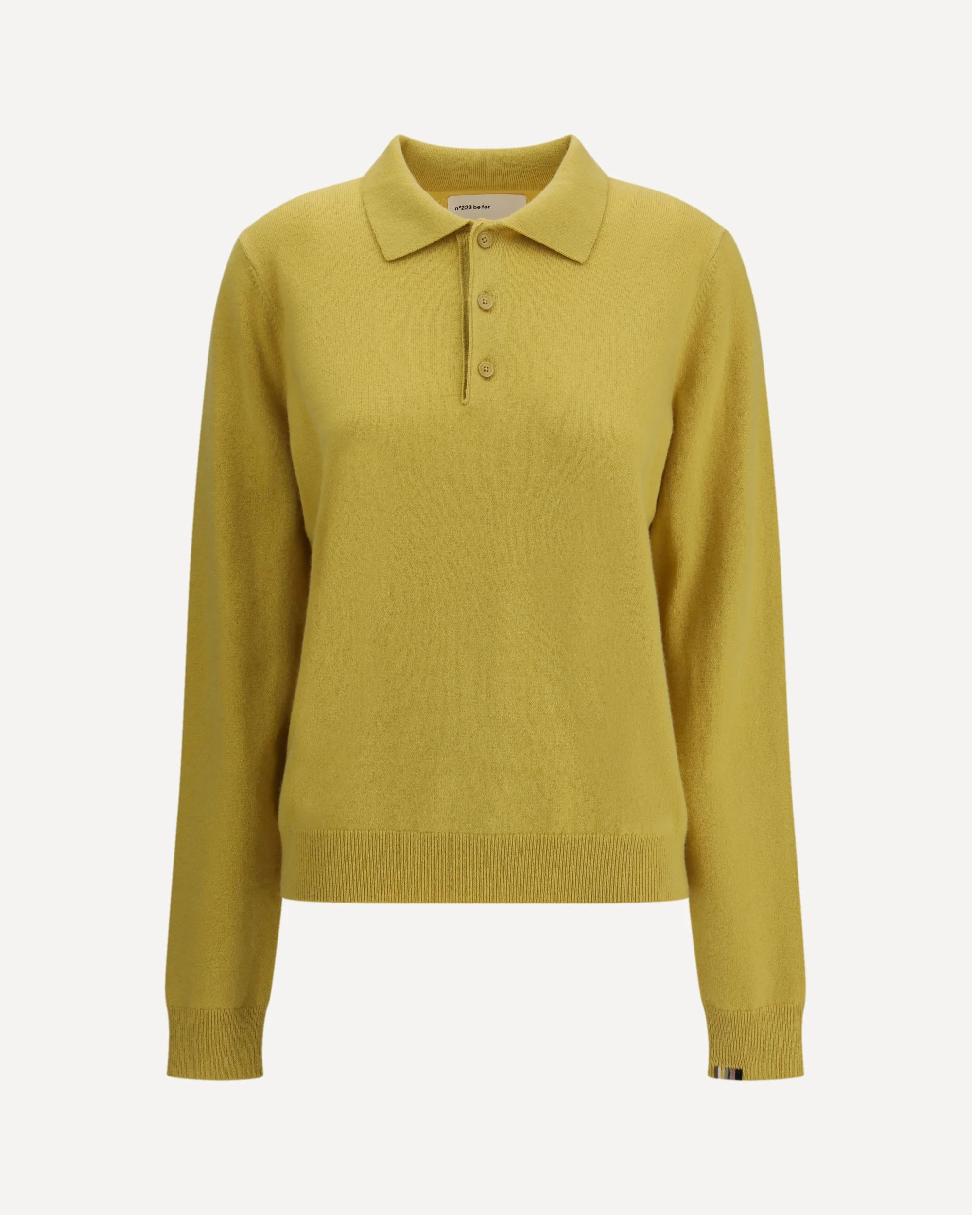 The n°223 be for by Extreme Cashmere is a modern reinterpretation of the classic cashmere polo-neck sweater with a three-button closure. Thoughtfully crafted, it features rib-knitted finishes at the neck, cuffs and hem, along with long sleeves that highlight its clean, comfortable silhouette. The corozo buttons—an exceptionally durable, chemical-free material derived from the seed of a palm tree—add an authentic and sustainable touch, balancing elegance and practicality. DETAILS - Sku: 22321001TU01_CORN - Season: SS26 - Fit: Regular - Composition: GENERAL 89% Kashmir/capra Hircus 10% Nylon 1% Elastane - MADE IN CHINA