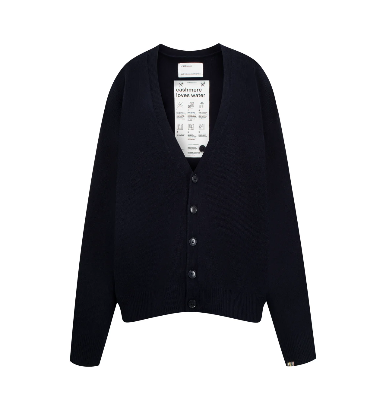 EXTREME CASHMERE Jonah Sweater featuring a slouchy, relaxed-fit cashmere cardigan with a deep v-neck, fastened with five corozo buttons and rib-knit hem and cuffs. 94% cashmere, 5% nylon, 1% elastane. DESIGNER STYLE ID: 459-001-01-TU-02 COLOR: NAVY