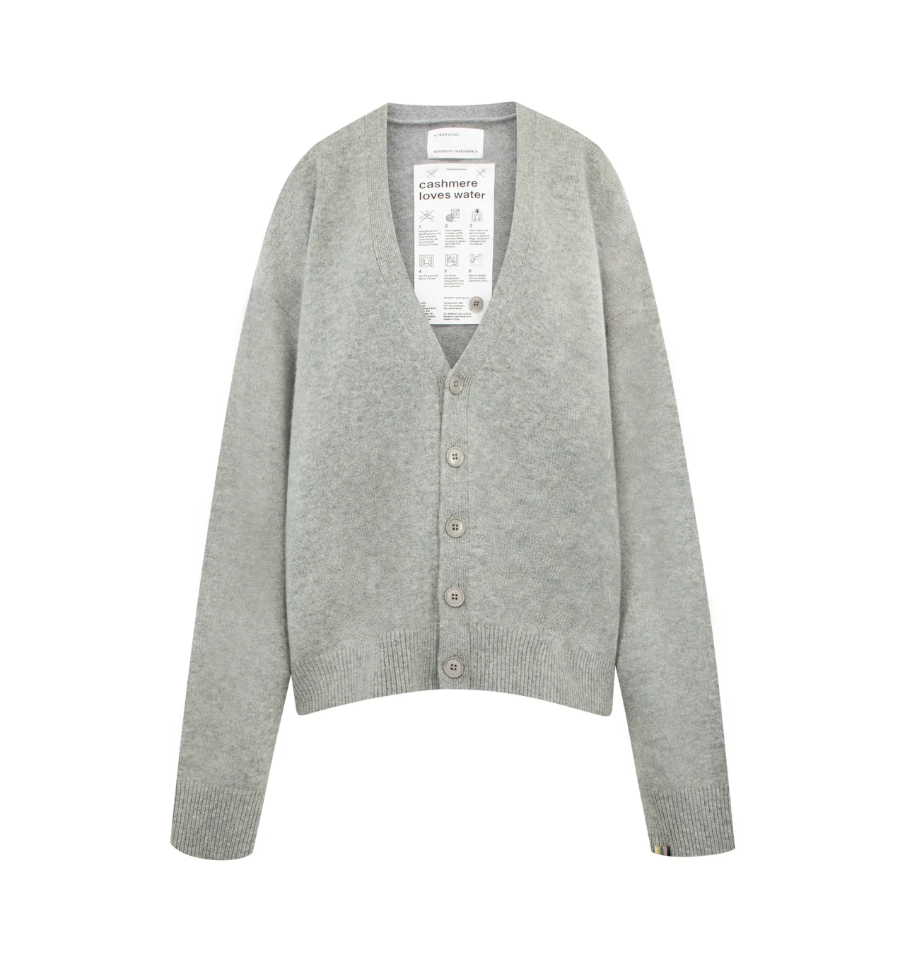 EXTREME CASHMERE Jonah Sweater featuring a slouchy, relaxed-fit cashmere cardigan with a deep v-neck, fastened with five corozo buttons and rib-knit hem and cuffs. 94% cashmere, 5% nylon, 1% elastane. DESIGNER STYLE ID: 459-209-01-TU-02 COLOR: GOAT